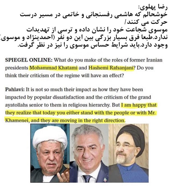 ۱۱- گام بعدی ارتباط پهلوی و رفسنجانی در سال ۱۳۸۸ برداشته شد جایی که رضا پهلوی در مصاحبهای با اشپیگل آلمان بطور علنی از رفسنجانی حمایت کرد!