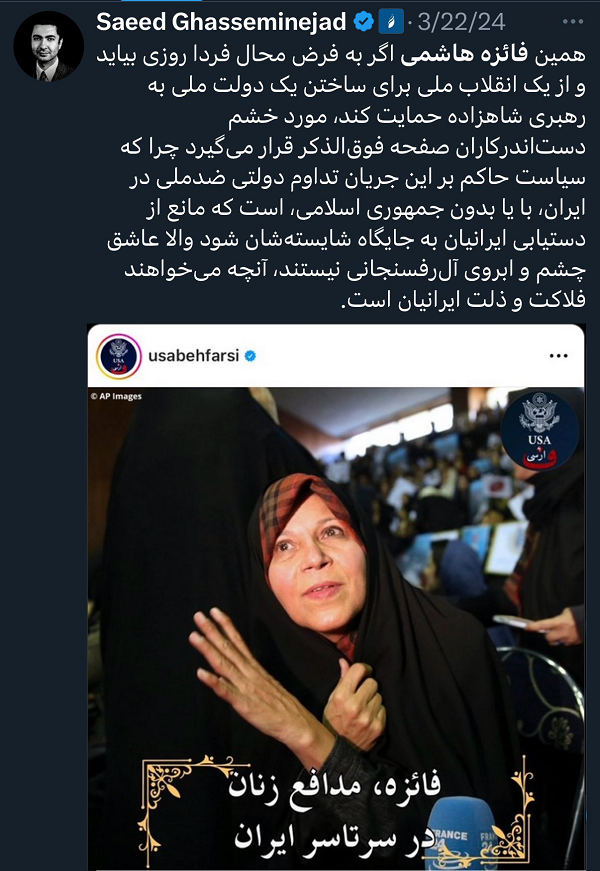 ۱۲- و در نهایت فائزه هاشمی در سال ۱۳۹۹ در یک مصاحبه مطبوعاتی با وبسایت خبری «دیدار نیوز» تلویحا از رضا پهلوی و سلطنتطلبی حمایت کرد