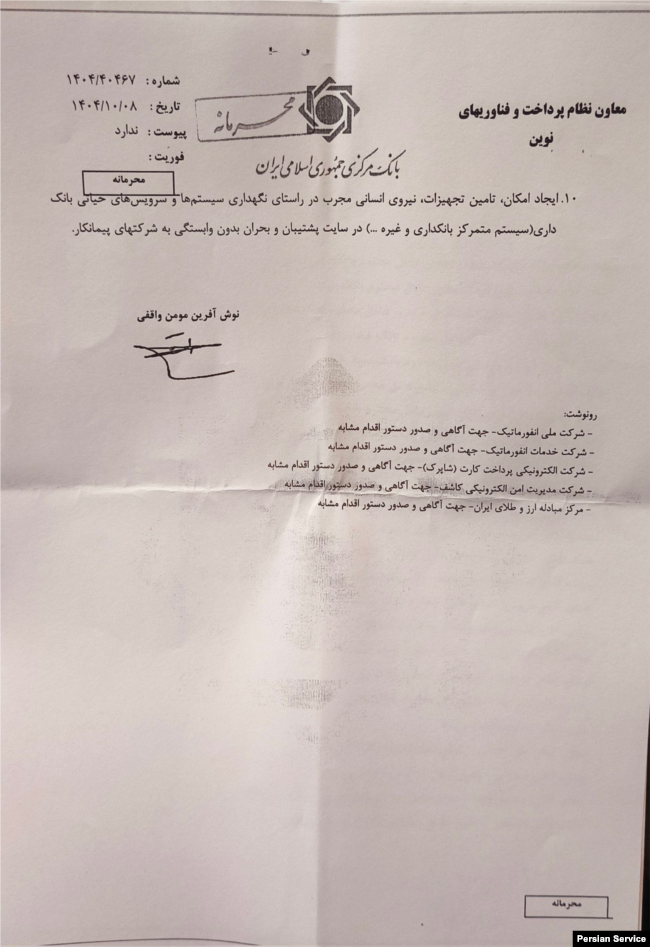 صدای آمریکا: بانک مرکزی ایران در نامهای محرمانه که نسخهای از آن در شبکههای اجتماعی دستبهدست میشود، از بانکهای کشور خواسته است برای سناریوهایی مانند قطع برق، اختلال پیامک و «تهدیدات سایبری» آماده شوند و برنامه تداوم خدمات بانکی را به اجرا بگذارند. این سند، در صورت اصالت، در ادامه سابقه جمهوری اسلامی در استفاده از قطع و اختلال اینترنت و زیرساختهای ارتباطی همزمان با اوجگیری اعتراضات سراسری ارزیابی میشود.