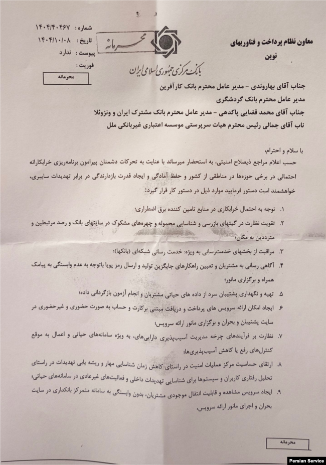 این نامه با سربرگ «بانک مرکزی جمهوری اسلامی ایران» و عنوان «معاون نظام پرداخت و فناوریهای نوین» و با طبقهبندی «محرمانه» و تاریخ ۸ دی ۱۴۰۴ خطاب به مدیران عامل چند بانک و یک مؤسسه اعتباری صادر شده است. در ابتدای متن، با ادبیاتی آشنا در مکاتبات رسمی جمهوری اسلامی، به «احتمال خرابکاری برنامهریزیشده دشمنان» و «تهدیدات سایبری» اشاره شده و از مدیران بانکی خواسته میشود در چارچوب «اقدامات پیشگیرانه» عمل کنند.